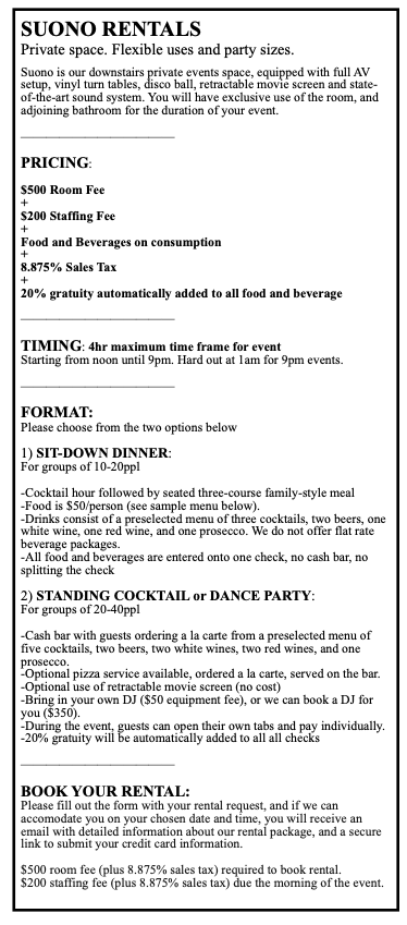 Multi-use space perfect for private dinners, movie screenings, intimate musical performances, cocktail and wine events, and DJ dance parties.