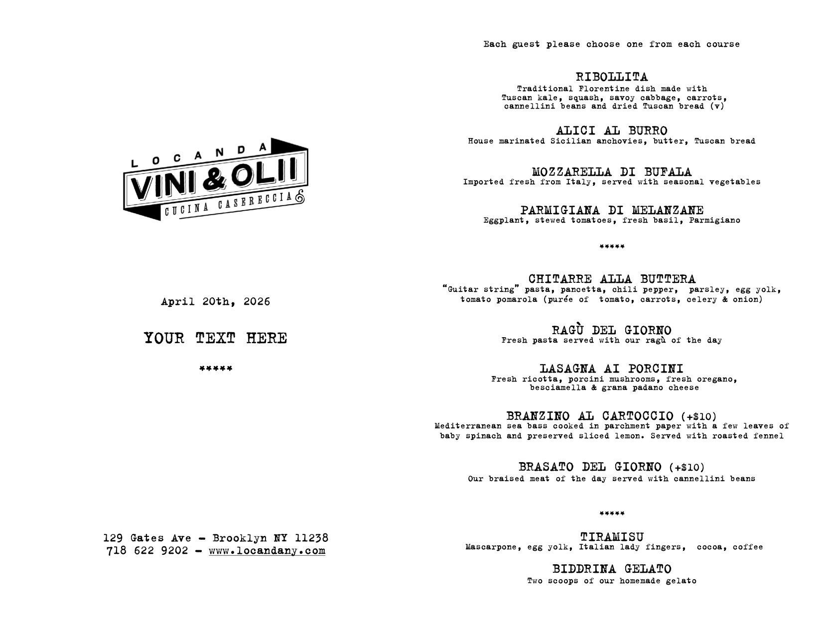 Each guest orders from a smaller version of our regular menu and chooses individually one antipasti, one pasta or main course, & one dessert. All drinks are a la carte.